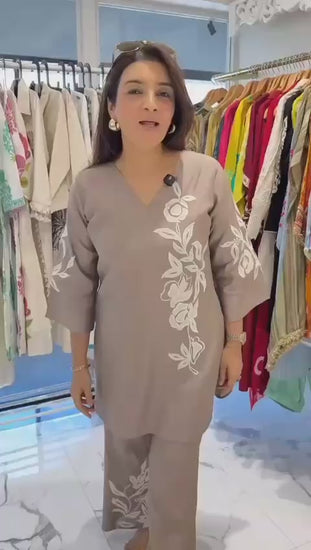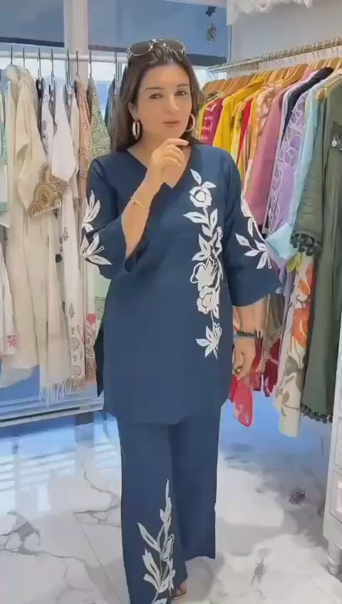 😍 Add effortless charm to your wardrobe with this Elegant Cotton Slab Co-ord Set, designed in a soft, breathable cotton fabric for all-day comfort. The soothing tones are beautifully highlighted with white floral appliqué and embroidery work on the kurta, sleeves, and bootcut pants, giving it a classy yet contemporary look.